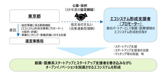そこで、創薬・医療系スタートアップのエコシステム形成を目指す事業実施に向け、今年度から、都と連携し、複数年度で事業を実施するエコシステム形成支援者(以下「プロモーター」という。)を令和4年11月4日より募集していましたが、下記のとおり採択プロモーターが決定しましたのでお知らせします。