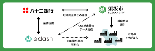 そこで本取り組みにおいては、須坂市が費用を負担し、長野県のトップバンクとして地域経済の発展に取り組む八十二銀行が協力する形で、市内企業5社がe-dashを半年間無料で使用しながら排出量の可視化に着手しています。