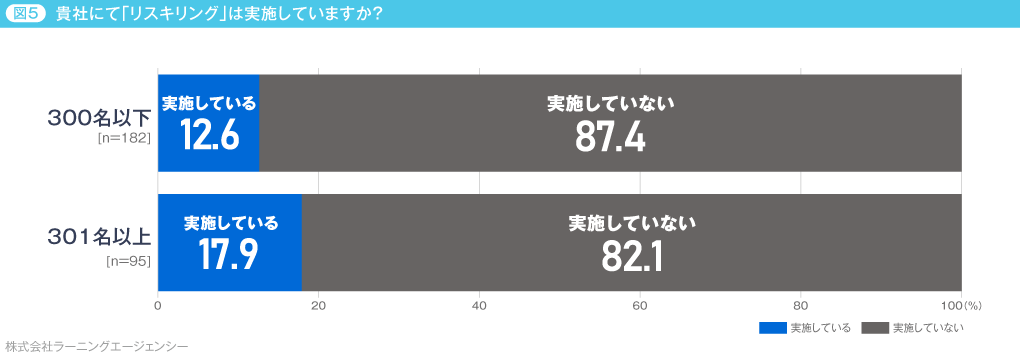 結果、リスキリングを取り組んでいる企業は、300名以下では12.6%、301名以上では17.9%という結果となりました。まだまだ取り組みは進んでいない状況であることがわかりました。(図5)
