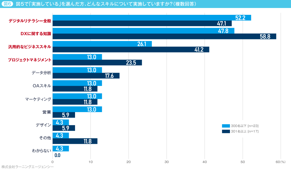 300名以下では「デジタルリテラシー全般(52.2%)」が最も高く、次いで「DXに関する知識(47.8%)」、301名以上では逆転し、「DXに関する知識(58.8%)」、次いで「デジタルリテラシー全般(47.1%)」となりました。301名以上の企業では、「汎用的なビジネススキル」や「プロジェクトマネジメント」のリスキリングも進められており、DXだけでなく幅広い分野にて実施されている状況が見られました。(図6)