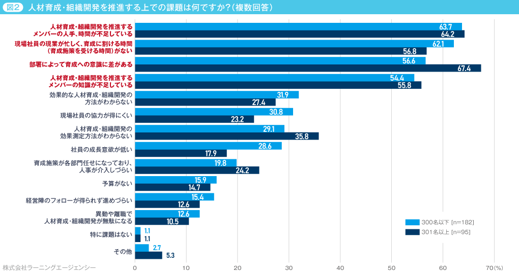 2.人材育成・組織開発を進める上での課題、6割超の人事が「推進メンバーの人手・時間不足」と回答。301名以上の企業では、「部署による育成への意識の差」がさらなる課題に