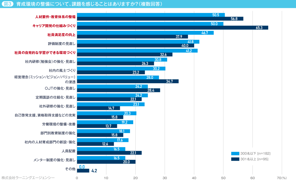 一方、「社員満足度の向上」「社員の自発的な学習ができる環境づくり」は300名以下が301名以上よりも約9ポイント高くなり、4割超が課題を感じている結果となりました。(図3)