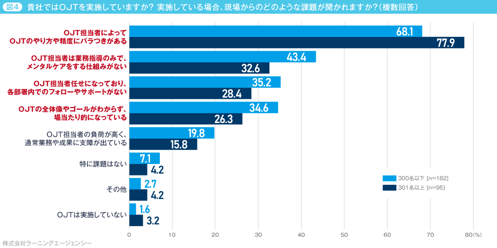 次に、育成環境の一つであるOJTについて見ていきます。OJTの実施の有無については、従業員規模に関わらず、どちらも95%以上の企業がOJTを実施している結果となりました。高い実施率のOJTですが、実施における課題について聞いてみたところ、「OJT担当者によってOJTのやり方や精度にバラつきがある」が300名以下では68.1%、301名以上では77.9%と最も高い割合となりました。全体的な課題感は300名以下の方が高く、次に「OJT担当者は業務指導のみで、メンタルケアをする仕組みがない(43.4%)」「OJT担当者任せになっており、各部署内でのフォローやサポートがない(35.2%)」「OJTの全体像やゴールがわからず、場当たり的になっている(34.6%)」と続きました。300名以下の企業では、OJTの仕組みが構築されていない状況であることが伺えます。(図4)