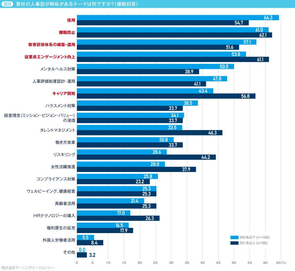 6.人事部が興味のあるテーマ、300名以下は「採用」「離職防止」「教育研修体系構築」、301名以上は「離職防止」「従業員エンゲージメント向上」「キャリア開発」と違いが出る結果に