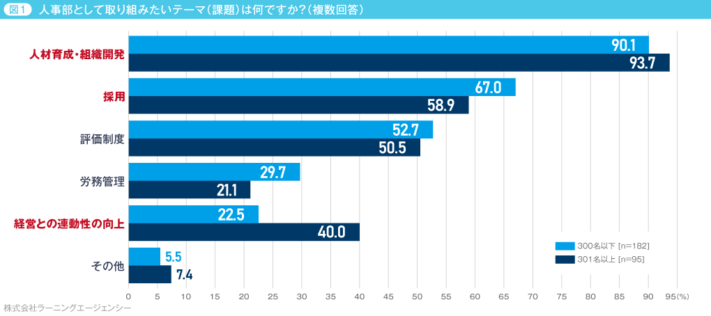 1.人事部として取り組みたいテーマ、従業員規模に関わらず9割の人事が「人材育成・組織開発」と回答