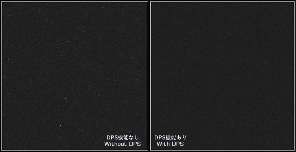 DPSテクノロジーが搭載されたPlayer Oneのカメラは、ホットピクセルやクールピクセルと言った欠損画素(デッドピクセル)を自動で判別し、カメラ内部のメモリへ記録することで撮影時に自動的に補正を行います。これによりデッドピクセルを大幅に抑制することができます。