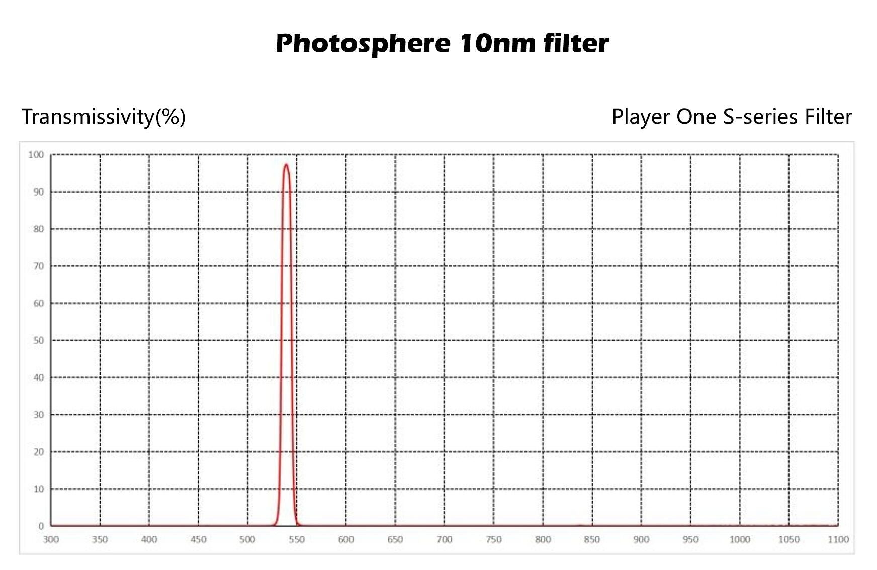 半値幅10nmで中心波長540nmの光を通すバンドパスフィルターです。モノクロカメラに装着することで、太陽黒点など太陽の光球の様子を撮影する際にコントラスト向上が期待できる、可視光での撮影に適したフィルターです。なお、太陽の撮影時は、必ず別途ソーラーフィルムなどの太陽撮影専用の減光機材を使用してください。フォトスフィア10nmフィルター単独での使用は絶対に行わないでください。