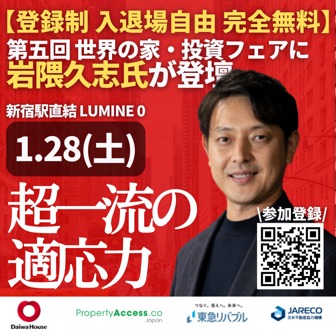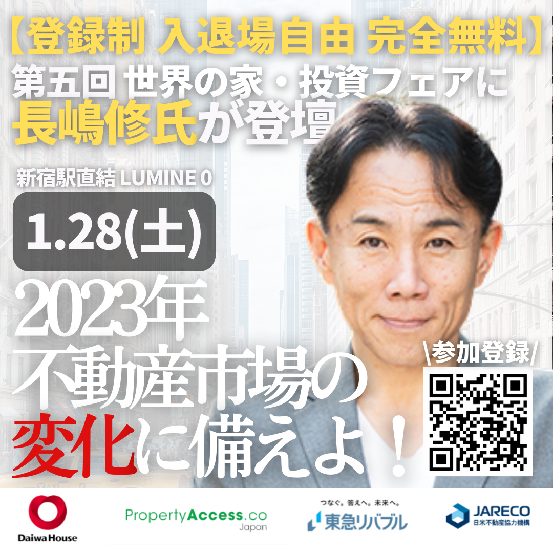 世界の家・投資フェアとは2023年1月27日及び1月28日に、およそ2年半ぶりとなる世界の不動産イベント「世界の家・投資フェア2023」が新宿 LUMINE 0で開催いたします。あの不動産コンサルタント長嶋修氏もリアル登壇「2023年の不動産市場の変化に備えよ!日本と世界の不動産を見渡す」というタイトルで講演。長嶋氏のリアル登壇は非常に貴重な機会です。