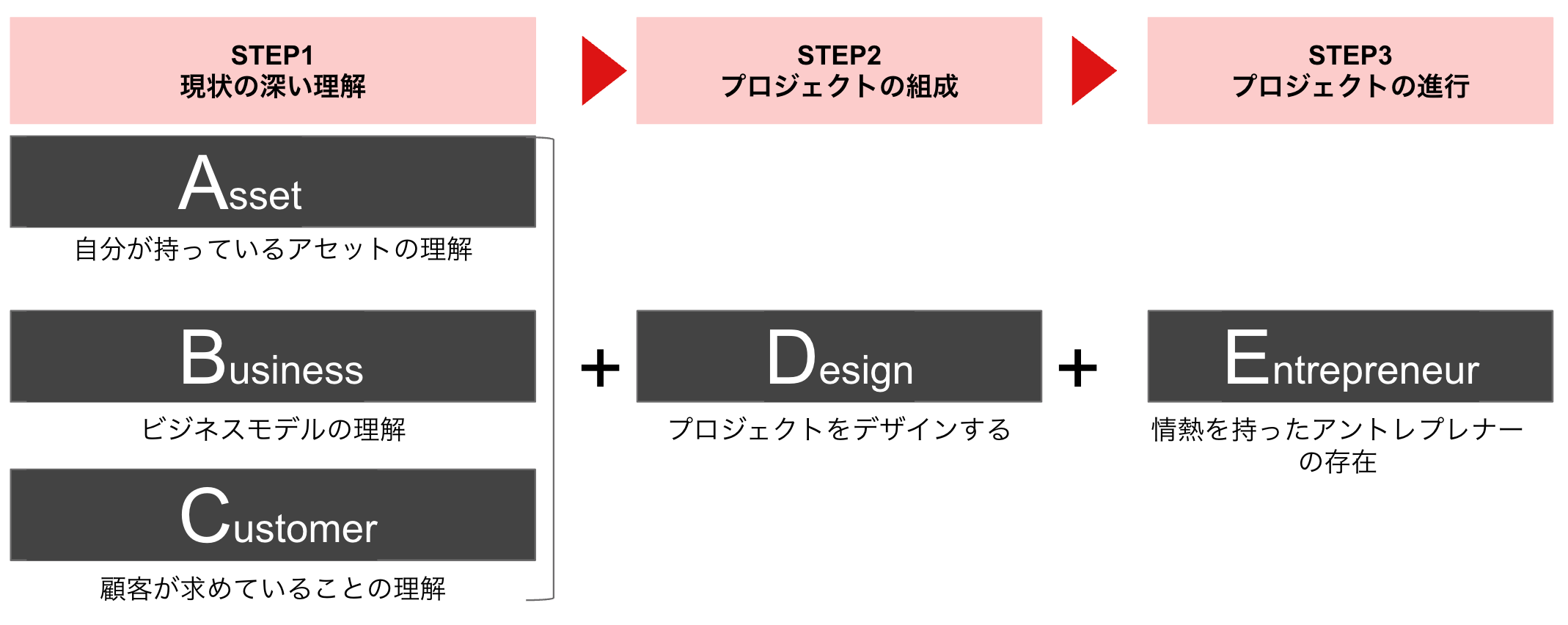 | D: Design | A, B, Cの理解を深めた上で、自社のアセットやビジネス、顧客との関係性の中にスタートアップのビジョンや技術、ビジネスを組み込むことで生まれる新しい展開を構想し、具体的なプロジェクトをデザインします。 |