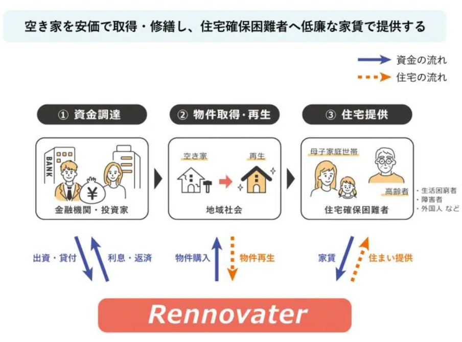 Rennovaterは、生活困窮者、単身高齢者、障がい者、母子家庭世帯、外国人など不動産賃貸契約を結ぶ際に困難に直面することの多い方々に向け、民間資金で空き家や築古物件を安価で取得、再生した上で、低廉な賃料で提供する住宅支援事業を展開しています。