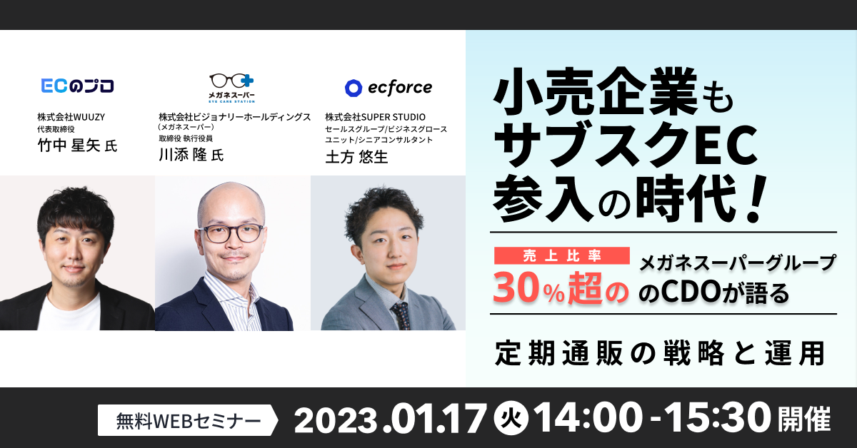 本セミナーは、 個人としてEコマース業界を盛り上げるための発信を行い、 株式会社ビジョナリーホールディングス(メガネスーパーグループを運営する親会社)の取締役 執行役員CDO兼CIOを務める川添隆氏もゲストでお迎えし、 売上・利益アップを目指すEC/D2Cにヒントとなる戦略からアフターコロナ時代のサブスクモデルについてなど、 EC/D2Cの最新ノウハウについてお話しいただきます。