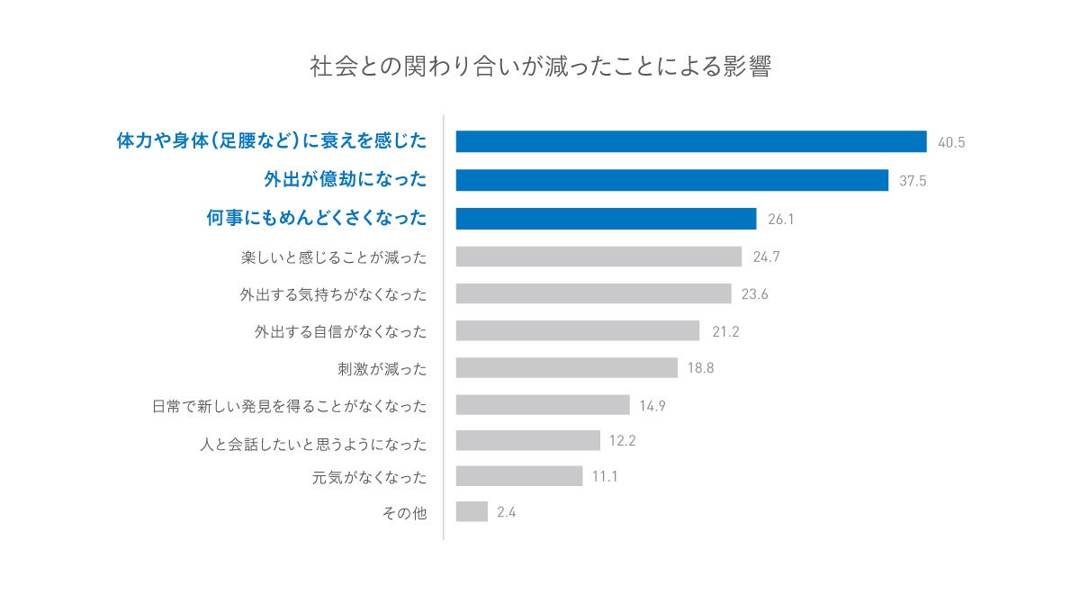 外出・社会との関わりが減ったことで、4割以上が「体力や身体に衰えを感じた」と回答しました。また、上位には生活意欲の減退がうかがえる回答が挙がっています(図2)。