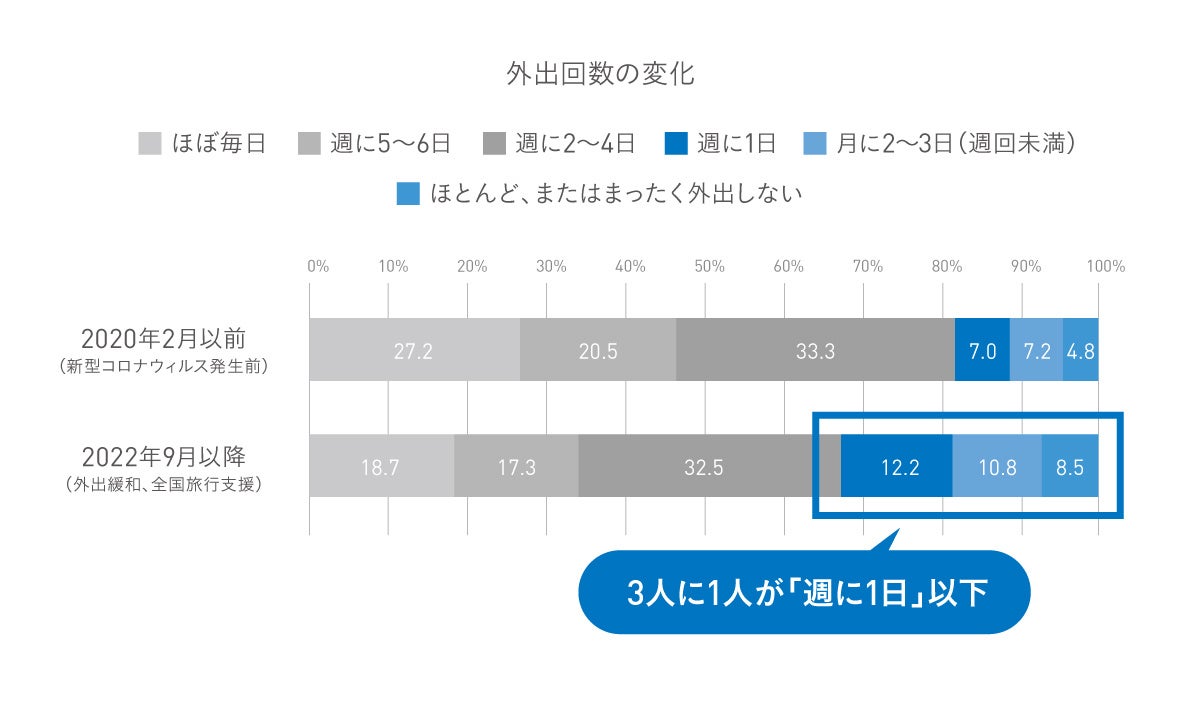 また、外出回数は、コロナ前は「ほぼ毎日」が3割程度(27.2%)いたものの、現在は8.5ポイント低下しています。2022年9月以降でも、3人に1人が「週に1日」以下(31.5%)と答えたほか、「ほとんど、またはまったく外出しない」と答えた人は、コロナ前と比べてほぼ倍増しました(図1)。