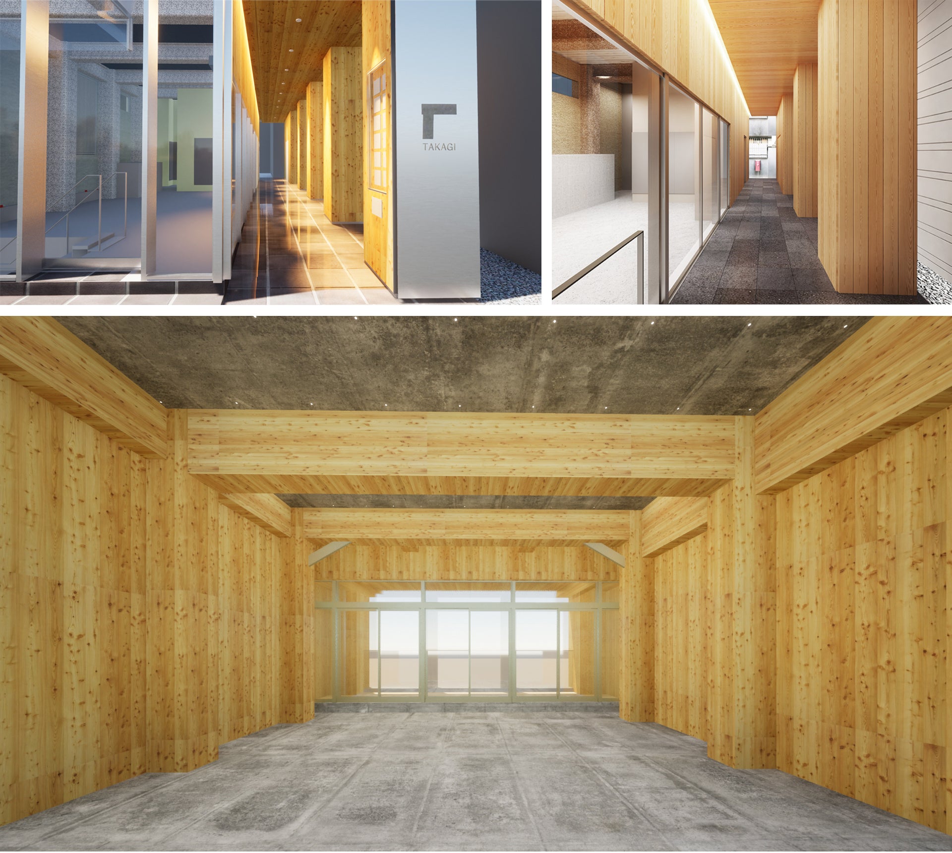 このビルの最大の特徴は、飲食店等が入居する予定の9階から最上階12階部分が木造であることです。最上部は外壁にも国産(東京都多摩市)のスギ材を使用し、木の箱を載せたようなデザインです。昨今、サスティナブルな建材として高層建築においても注目が高まっている「木造ビル」に、髙木ビルはいち早く取り組みます。