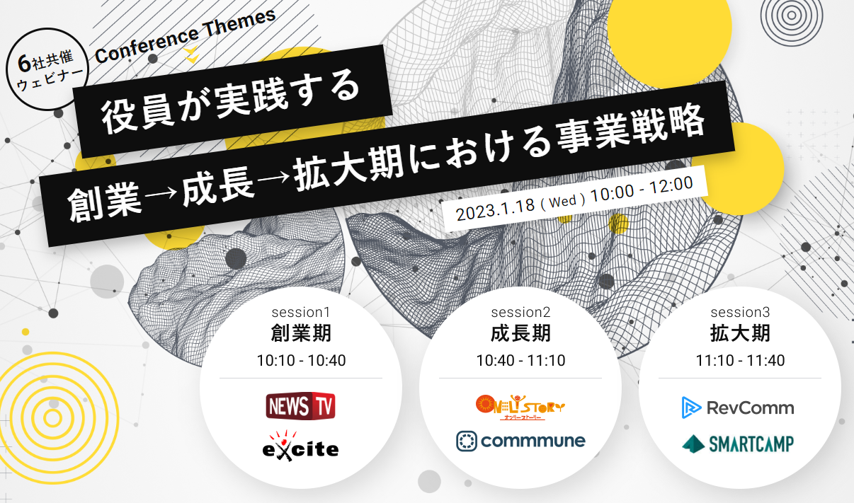今回のイベントでは、新しい年を迎え事業計画の立案や見直しを行う経営層、マーケティングやセールスに携わる方向けに、創業期・成長期・拡大期と大別し、それぞれについて複数社による対談形式によって、自社での事例や考え方について議論する企画となります。