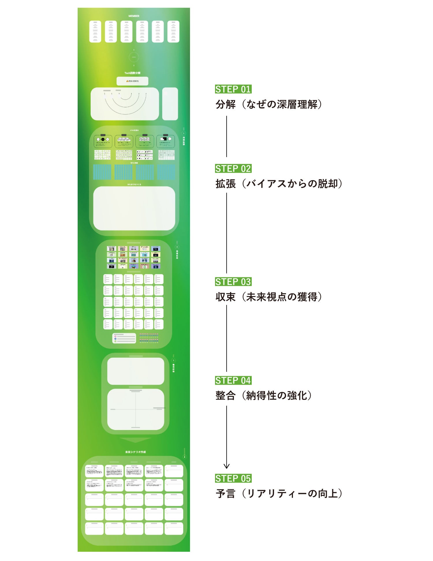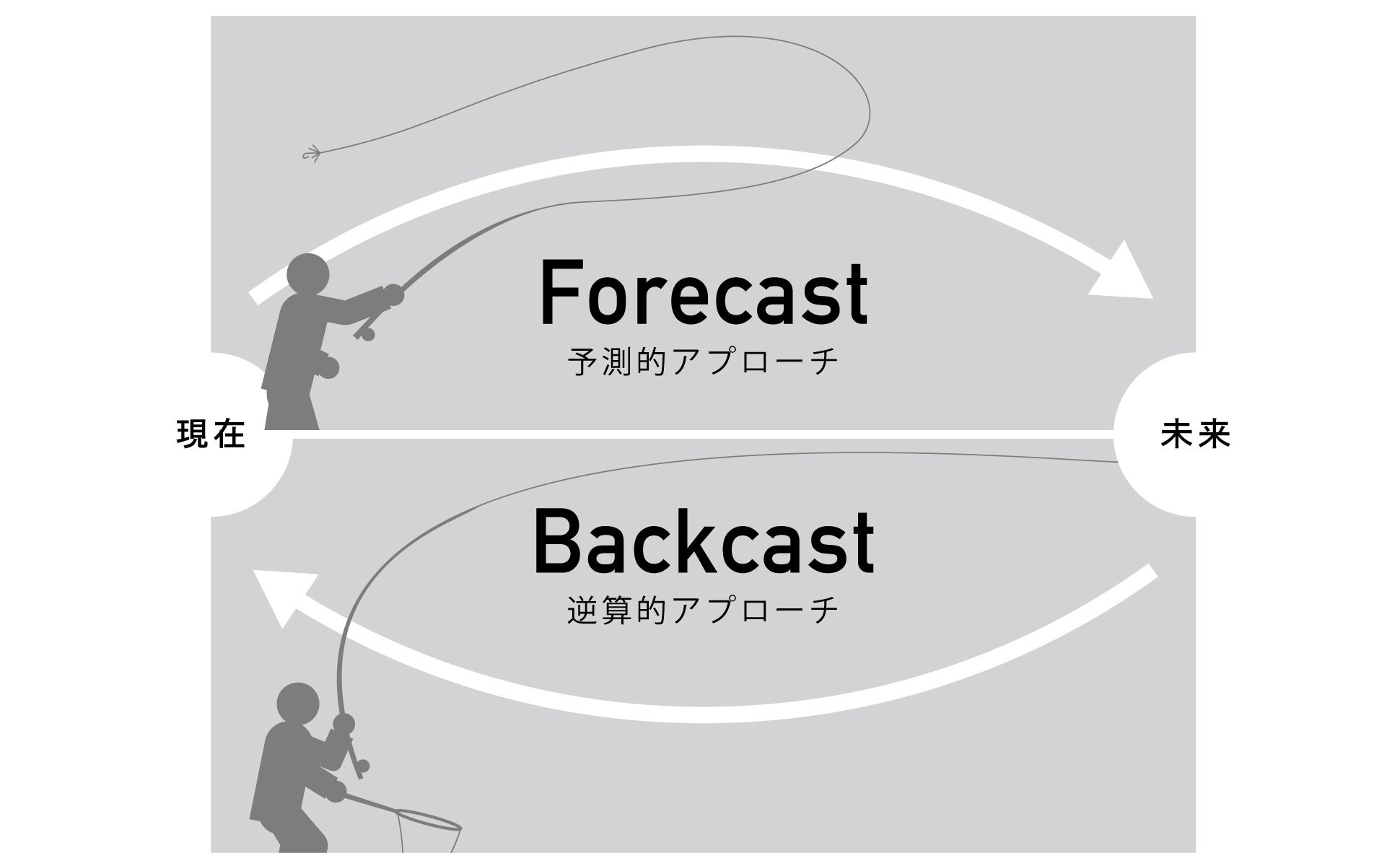 DUAL-CASTとは、テクノロジーのトレンドから飛躍的な事業アイデアを妄想する「フォーキャスト型アプローチ」と、プロトタイピングによって事業アイデアを具現化する「バックキャスト型アプローチ」の両面から成り立つ、未来事業の発想・実行プロセスを体系化したオープンイノベーション術です。