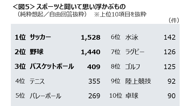 スポーツと聞いて思い浮かぶもの(純粋想起)を自由回答にて聴取した。「サッカー」と「野球」が2強、次いで「バスケットボール」「テニス」「バレーボール」と、メディアでの接触機会の多いスポーツが上位にあがった。<図5>