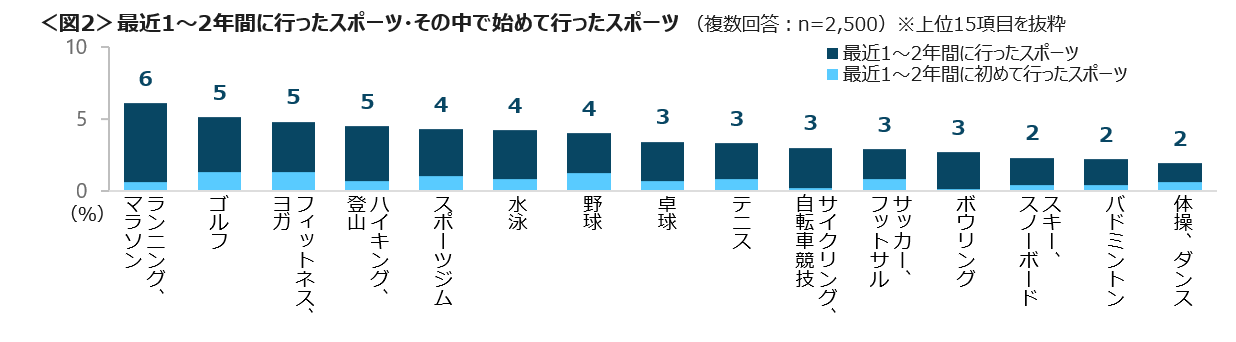 実施したスポーツの上位は、「ランニング、マラソン」「ゴルフ」「フィットネス、ヨガ」「ハイキング、登山」など。この1~2年で初めてチャレンジしたスポーツでは、「ゴルフ」「フィットネス、ヨガ」「野球」が多い。<図2>