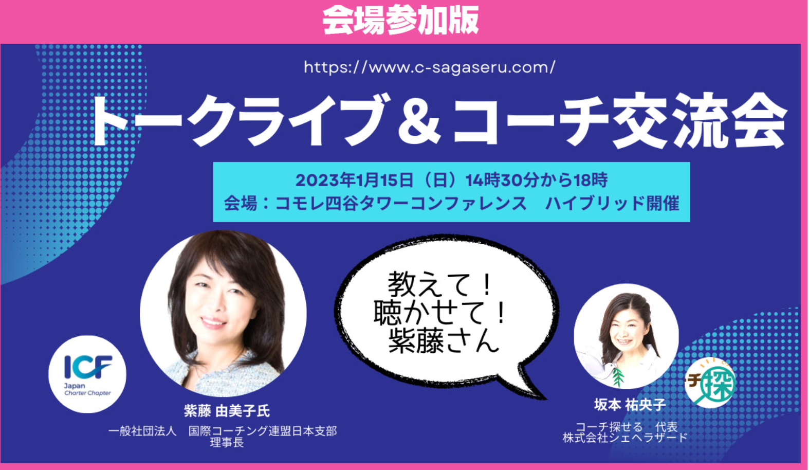 ▼トークLIVE&交流会~2023年のコーチ業界を語る「教えて、聴かせて、紫藤さん」~ トークゲスト ICF日本支部 代表理事 紫藤由美子さん 会場参加お申し込みはこちらから▼