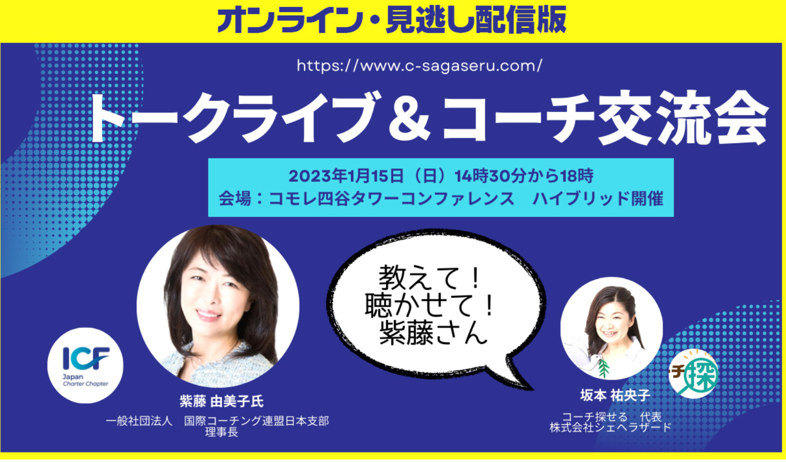 ▼トークLIVE&交流会~2023年のコーチ業界を語る「教えて、聴かせて、紫藤さん」~ トークゲスト ICF日本支部 代表理事 紫藤由美子さん ハイブリッドライブ配信及び見逃し配信お申し込みはこちらから▼