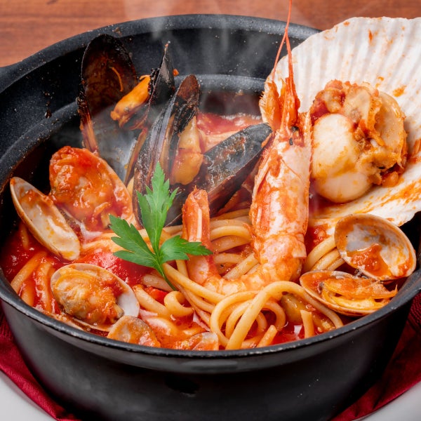 魚介の旨味が詰まったスープ仕立てのパスタ。魚介に合うパスタリングイネでお召し上がりください。