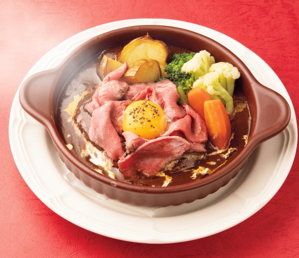 デミグラスソースで煮込んだハンバーグに、ローストビーフと黄身を載せた一皿。アツアツのハンバーグに、ソースと卵を絡めてお召し上がり下さい。