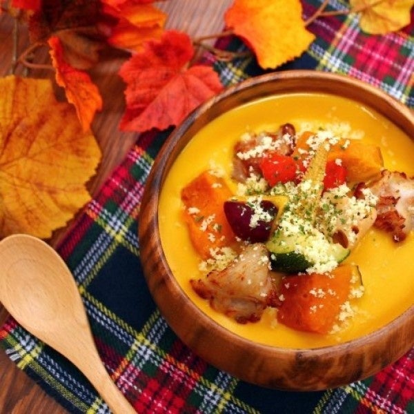 かぼちゃと豆乳をベースに、6種のごろっとした野菜とチキンが入った、食べ応えのあるシチューです。