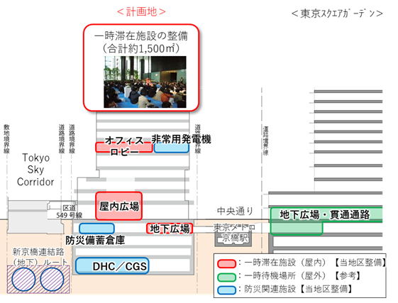 ・災害発生時における帰宅困難者の一時滞在施設として約1,500 ㎡(約900人相当)を確保するとともに、防災備蓄倉庫(約150 ㎡)を整備します。