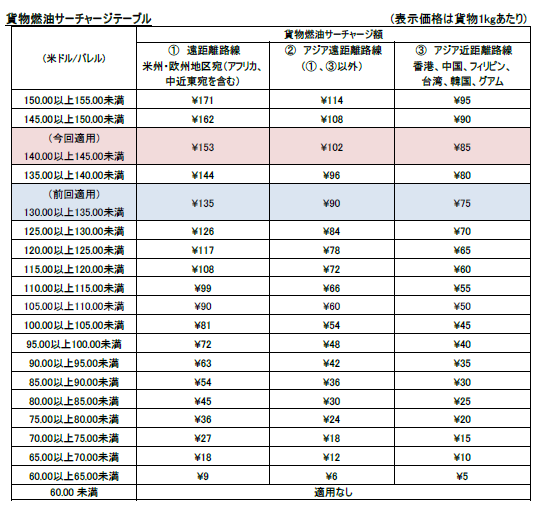 JALは、2022年7月1日から適用となる日本発国際貨物燃油サーチャージを、国土交通省へ申請しました。基準となる2022年5月のジェット燃料の平均価格が1バレル当たり142.76米ドルであったことから、燃油指標価格を「140.00以上145.00未満」とし、サーチャージ額は1kgあたり153円(米州・欧州など遠距離路線)、102円(アジア遠距離路線)、85円(アジア近距離路線)となります。