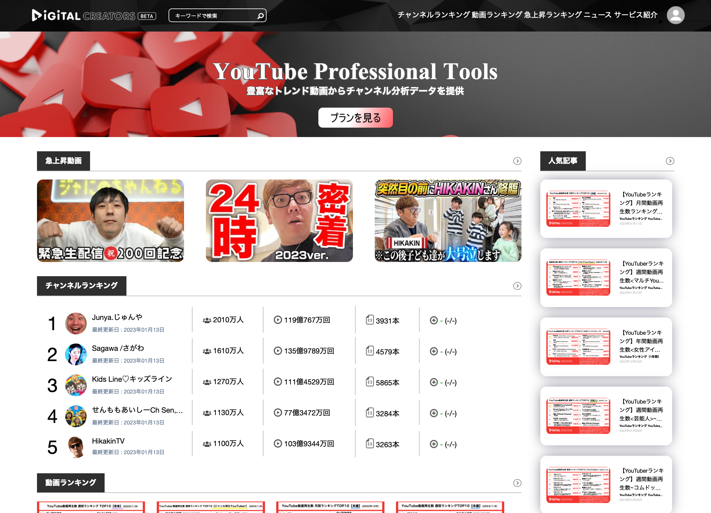 Digital Creatorsは、YouTubeの人気チャンネルや動画などのランキングデーターを無料でチェックできるサイトです。YouTube動画再生数ランキングは、週間ランキングや月間ランキングや年間ランキングなど期間別のランキングのほかに、ジャンル別ランキングなど、様々なデーターを公開していく予定です。