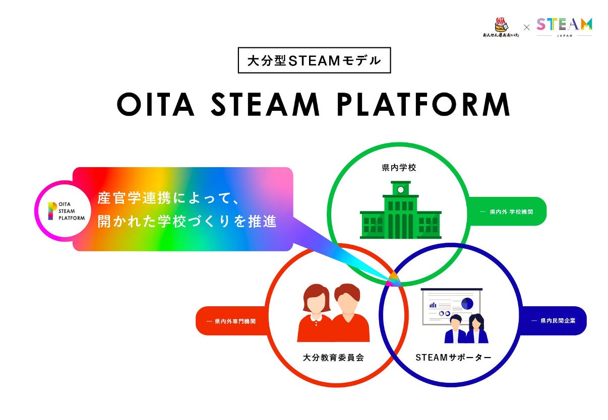 「OITA STEAM PLATFORM」とは、2021年度から始まった、大分県のSTEAM教育推進を目的とした産官学連携のプラットフォームです。自治体、教育委員会、民間企業、学校機関それぞれが密接に連携することで、包括的なSTEAM教育が学べる機会を提供します。