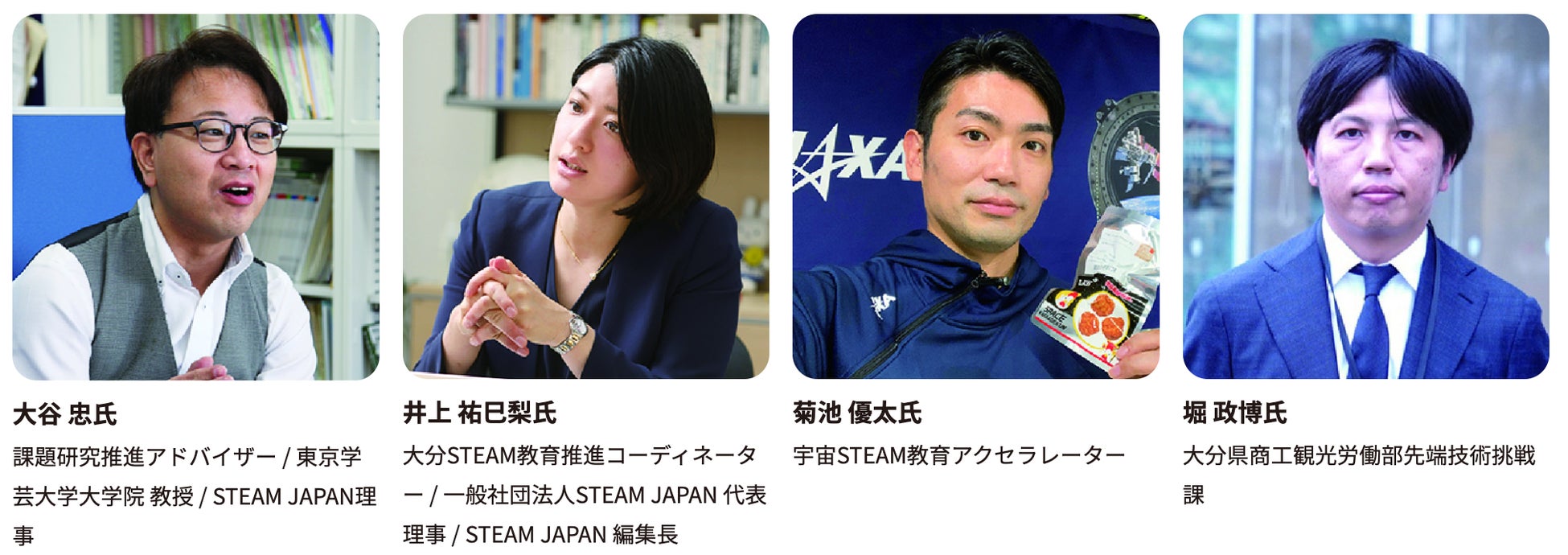宇宙をSTEAM探求するとはどういうことか、宇宙のこれからをどのように考えていくのか。東京学芸大学の大谷教授とSTEAM JAPANの井上代表理事、宇宙STEAM教育アクセラレーターの菊池氏、大分県商工観光労働部先端技術挑戦課の堀氏をはじめとした方々に教育に関わる立場からお話いただきます。