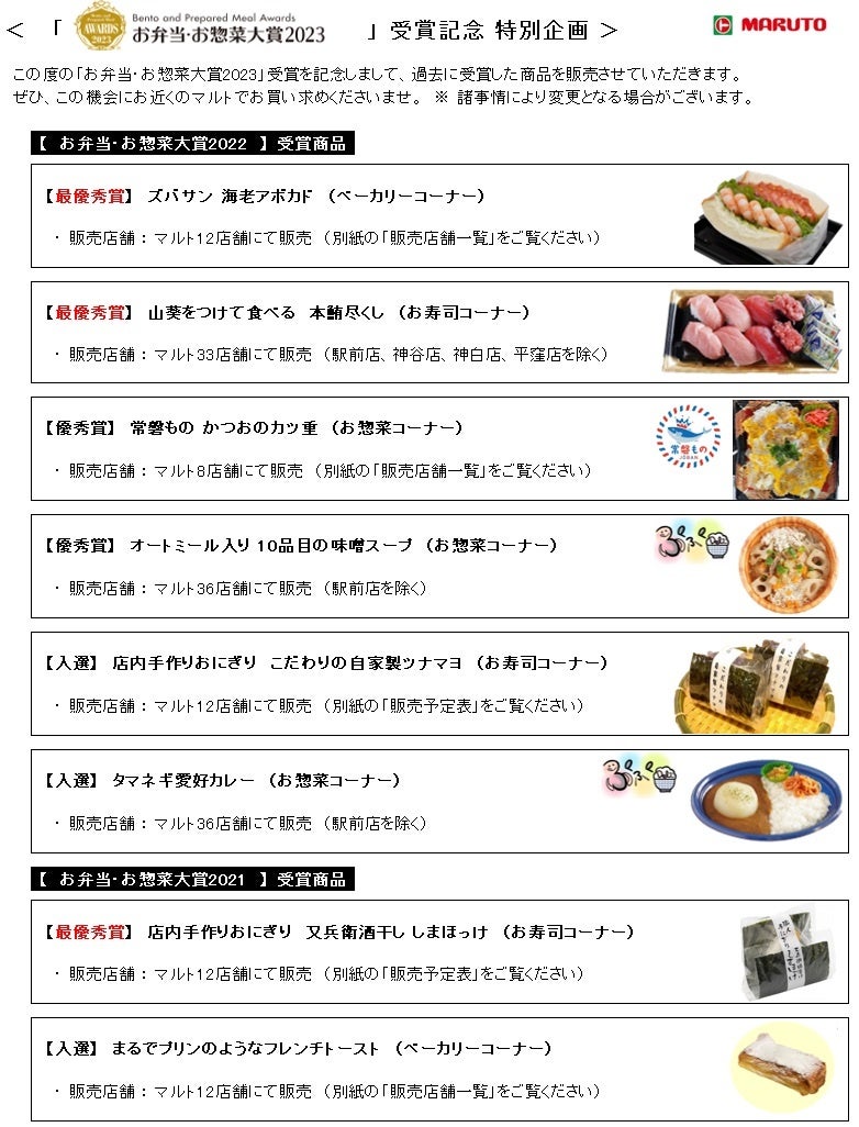 株式会社マルト(本社:福島県いわき市/代表:安島 浩)は、一般社団法人全国スーパーマーケット協会主催の「お弁当・お惣菜大賞2023」において皆様の常日頃のご指導ご協力の結果、3年連続での受賞をさせていただきました。