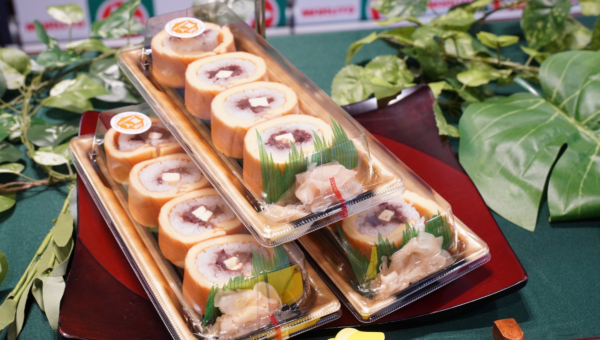 ②海苔の替わりに伊達巻で巻くことにより、あんこの甘み、バターの塩味がマッチした巻き寿司に仕上げました。③つぶあんとバターは北海道産を使用。
