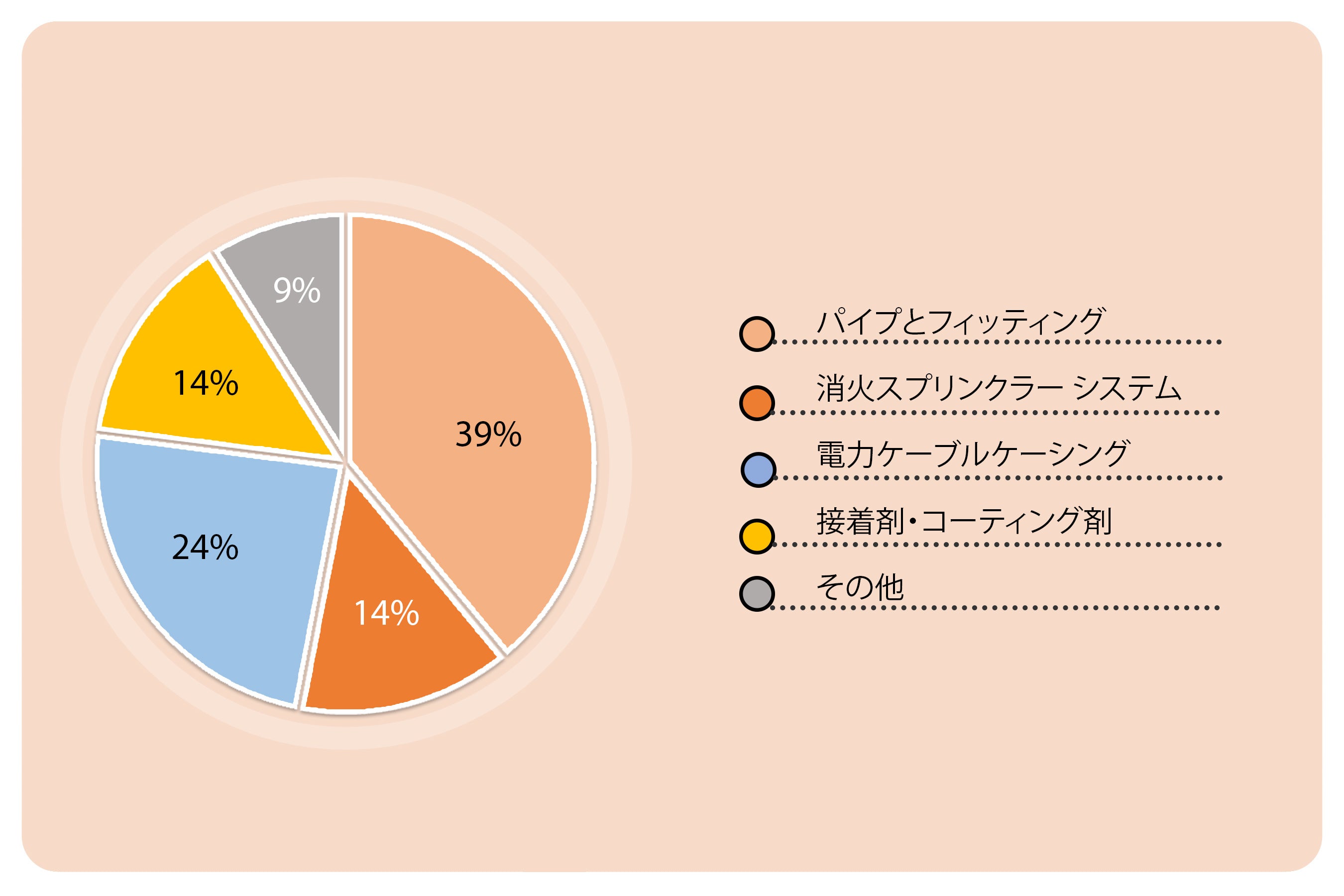 用途別に、パイプ・フィッティング、スプリンクラー・システム、電力ケーブル・ケーシング、接着剤・コーティング、その他に分類されます。
