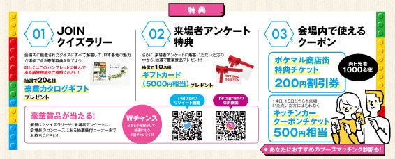 【来場三大特典!】ご来場の皆様にクイズラリー、アンケート抽選、会場内で使えるクーポンなど、様々の特典をご用意しております。ご来場は無料ですので是非お越しください。