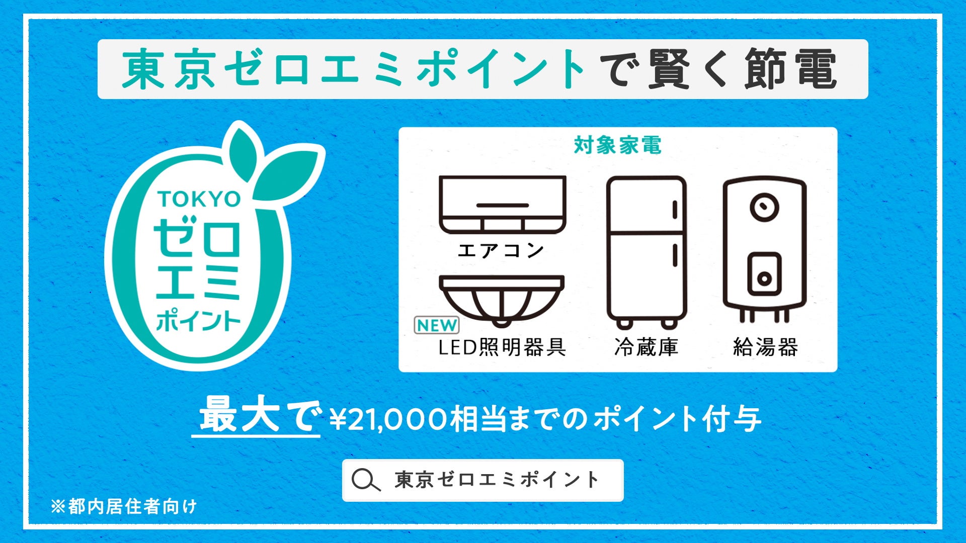 「東京ゼロエミポイント」とは、省エネルギー性能が高いエアコン、冷蔵庫、給湯器、LED照明器具に買い替えた方に、ポイントを付与する事業です。