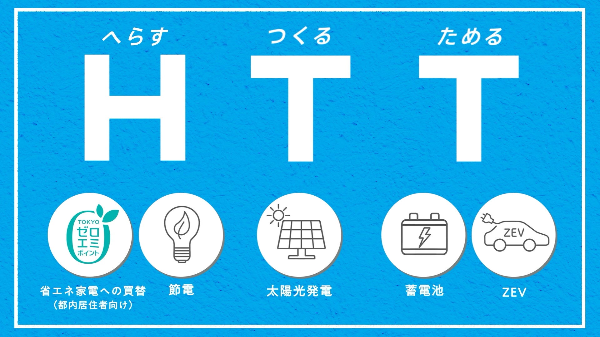 東京都では、気候危機への対応だけでなく、中長期的にエネルギーの安定確保につなげる観点から、電力を「Ⓗ減らす・Ⓣ創る・Ⓣ蓄める」=「HTT」をキーワードに、節電を始めとした電力確保の取組を進めています。