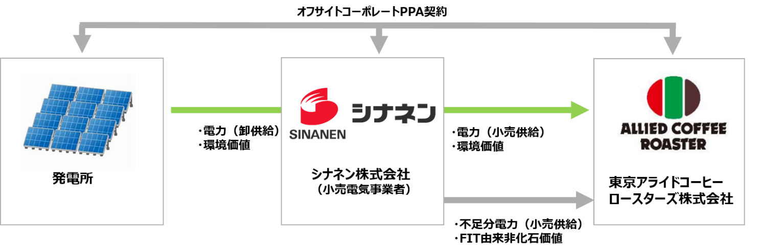 シナネンは、東京アライドコーヒーロースターズ向けに太陽光発電所を新設し、送配電網を介して電力供給を行います。また、オフサイトコーポレートPPA の太陽光発電だけでは不足する電力について、再生可能エネルギー発電所由来の非化石証書を付与することで、100%再生可能エネルギーの使用を実現します。
