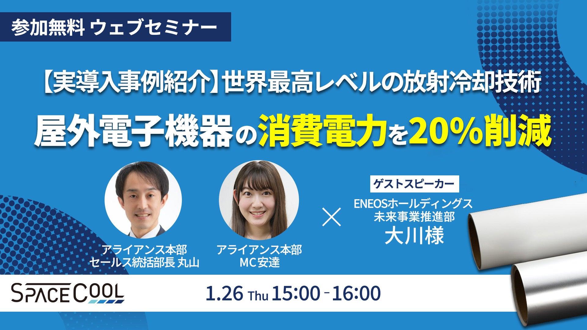 SPACECOOL 株式会社(代表取締役社長:宝珠山 卓志)は、屋外機器へ実際に施工し、実証実験にもご協力いただいたENEOS株式会社様をお呼びして、屋外機器への施工に関する疑問解消、脱炭素社会における省エネ対策をご紹介するウェビナーを1月26日(木)に開催します。