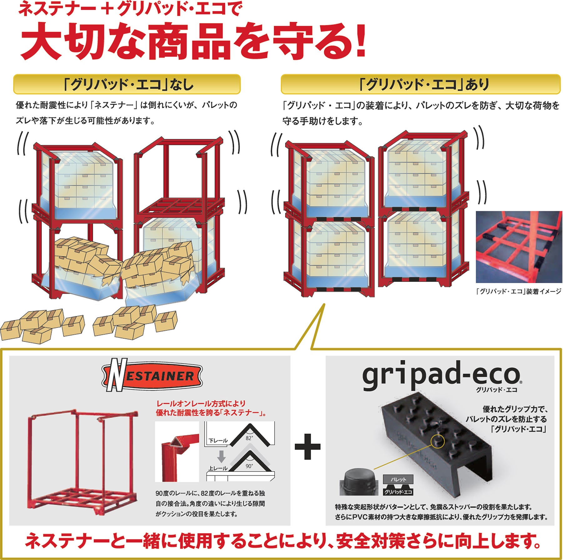 グリパッド・エコは、ご使用中のネステナーに装着するだけで、パレットのズレや落下のリスクを大幅に軽減する、塩化ビニール樹脂採用の耐震マット&ストッパーです。パレットの落下防止、倉庫内のBCP対策に最適です。