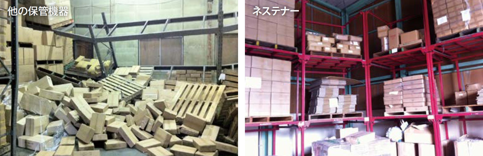 「ネステナー」は、“制震”“免震” “耐震”という3つの構造を合わせもったラックで、地震に強いのが特長です。