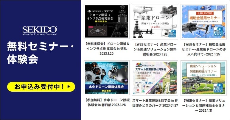 セキドでは、より多くの事業者の方にドローンを使った業務効率の改善を実現していただくため、業務用ドローンや関連ソリューションをご紹介する無料セミナーやイベントを定期的に開催しております。今後もオンラインや全国各地での開催を予定しておりますので、ご興味をお持ちのイベントにはぜひお気軽にご参加ください。