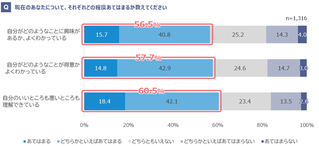 ・「自分がどのようなことに興味があるかよくわかっている」が56.5%、「自分がどのようなことが得意かよくわかっている」が57.7%、「自分のいいところも悪いところも理解できている」が60.5%と、就職活動を経ても、自己理解に関しては6割程度にとどまる(「どちらかといえばあてはまる」「あてはまる」の合計)。