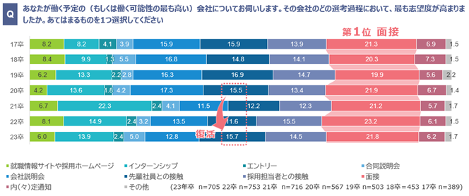 ・2023年卒では、コロナ禍で減った「先輩社員との接触」がコロナ禍前の2020年卒並に復活。