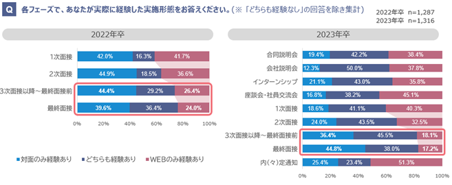 ・2022年卒に対し、2023年卒は「面接経験がオンラインのみ」という学生の割合が下がっている。