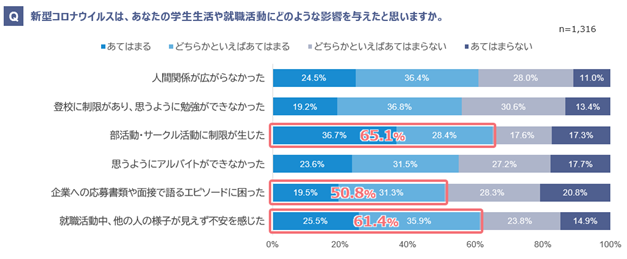 ・新型コロナウェルスの影響については、「部活動・サークル活動に制限が生じた」が65.1%(「あてはまる」「どちらかといえばあてはまる」の合計)で、最も影響が大きいと捉えられていた。