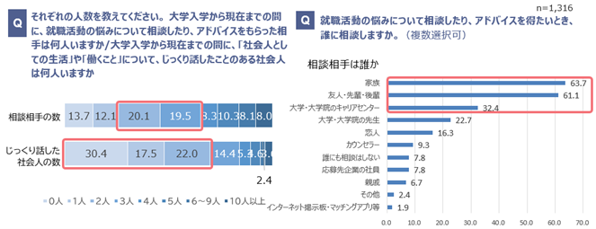 ・相談相手は、家族が63.7%と最も多く、次いで友人・先輩・後輩が61.1%と多い。
