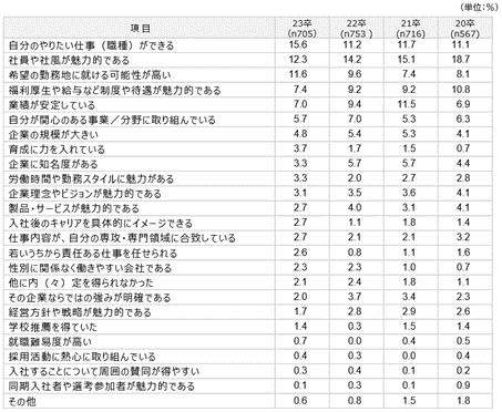 ・ 一方、「社員や社風が魅力的である」「福利厚生や給与など制度や待遇が魅力的である」「業績が安定している」は毎年上位に挙がっているものの、選択率は年々減少傾向にある。