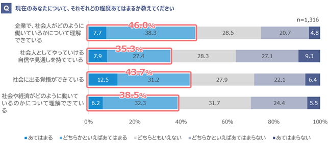 ・「企業で社会人がどのように働いているかについて理解できている」が46.0%、「社会人としてやっていける自信や見通しを持っている」が35.3%、「社会に出る覚悟ができている」が43.7%、「社会や経済がどのように動いているのかについて理解できている」38.5%と、社会人の自覚に関しては5割未満にとどまる(「どちらかといえばあてはまる」「あてはまる」の合計)。